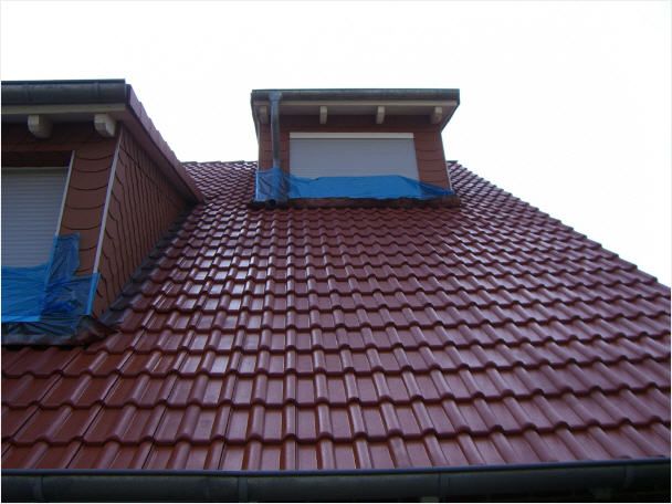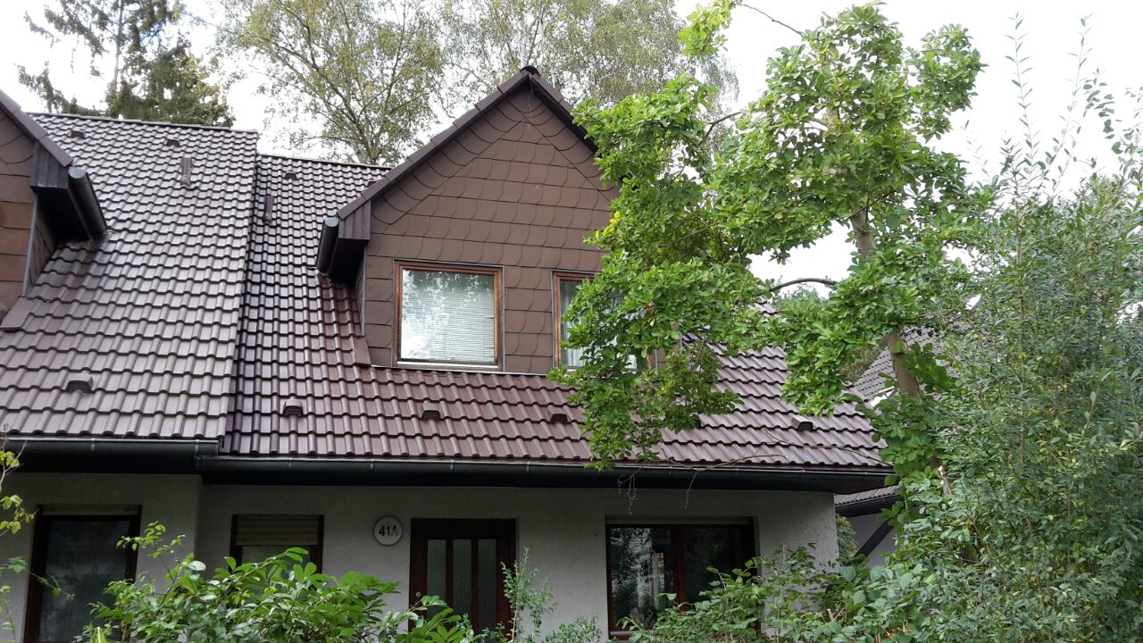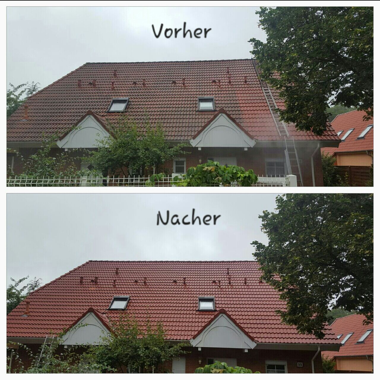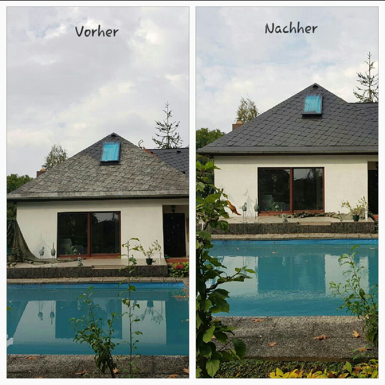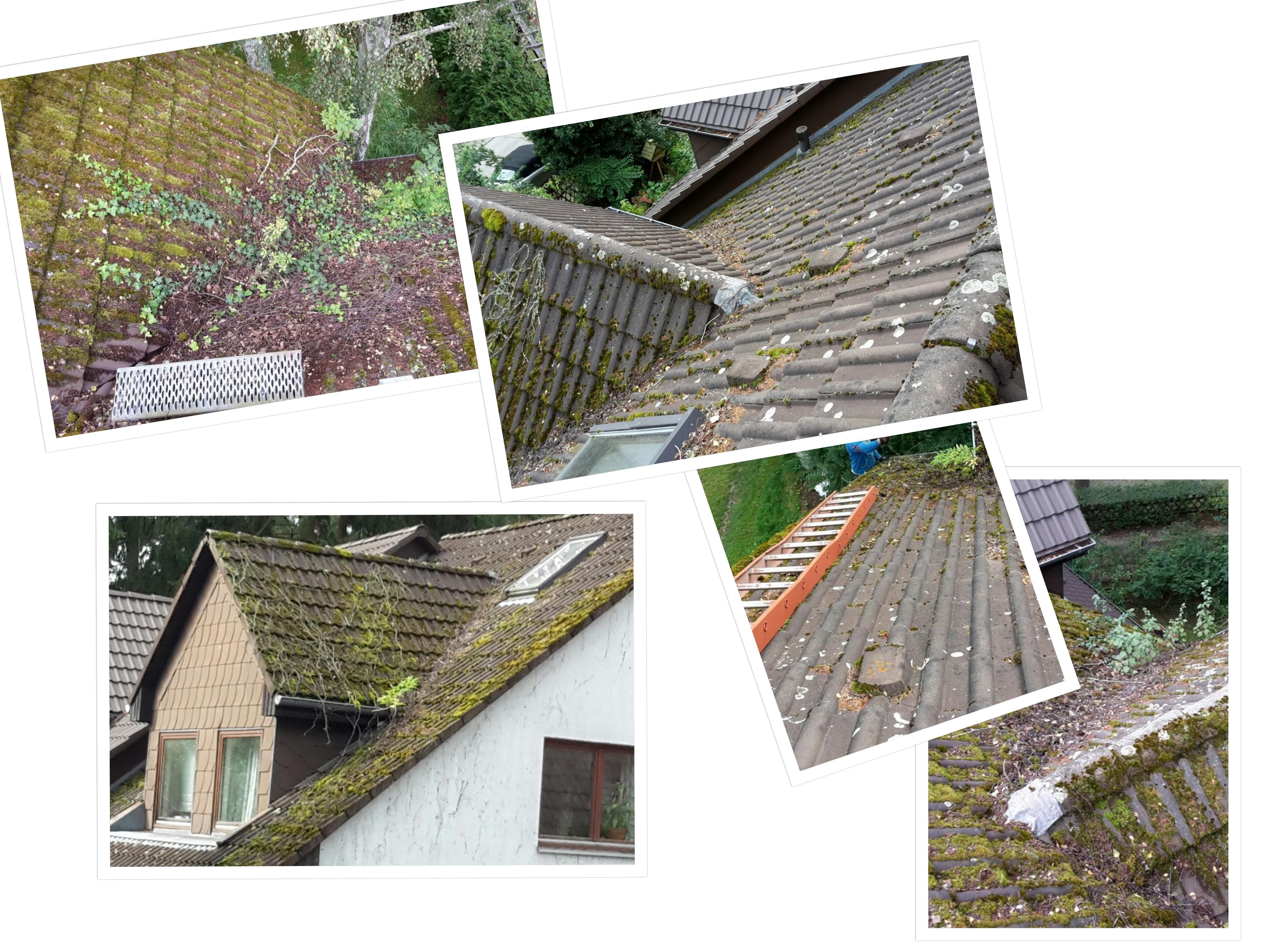 Die Säuberung des Daches von Flechten, Moos und anderen Verunreinigungen erfolgt mit Hochdruckreiniger (Kärcher), frei von chemischen Zusätzen.